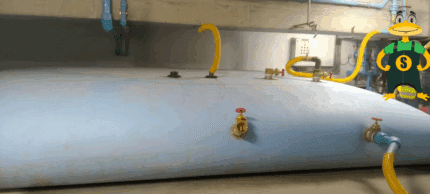 Illustration Maciterne Serena Group – citerne souple avec vanne laiton, mascotte expliquant installation citerne pluie